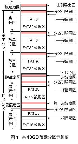 图1为某40GB硬盘的分区示意图,它使我们对硬盘的数据结构有一个基本了解。各分区长度为:第一分区 -- 6.32GB;第二分区 -- 6.32GB;第三分区 -- 6.32GB;第一逻辑分区 -- 19.86GB;第二逻辑分区 -- 2.15GB。图中用淡红色标明的扇区(尤以主引导扇区和第一分区引导扇区为最)是易受病毒攻击的扇区。