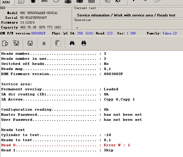 4、更换完成后将硬盘连接到专业工具后尝试进行加电操作,如果硬盘能够顺利就绪并且型号和容量识别正常后首先对硬盘固件做完整的备份,以备当现有磁头性能不良后硬盘状态不稳定后虚拟加载固件引导硬盘操作。