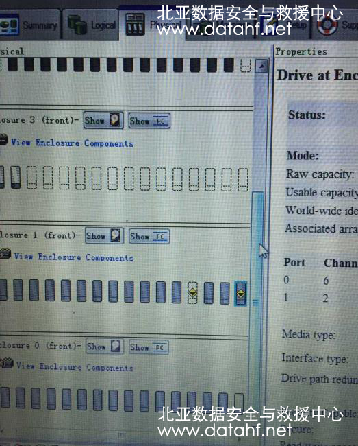 首先收集IBM DS5300存储日志信息。从存储上硬盘的指示灯看到有两块盘亮黄灯,对收集到的日志信息进行分析,分析两块硬盘的掉线时间,从而知道那块硬盘里面的数据是最新,用数据最新的硬盘进行数据恢复。